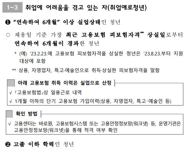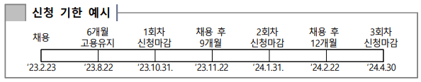 - 지원요건 : 정규직 채용 후 6개월 이상 고용유지, 주 30시간 이상 근로 및 최저임금 이상 지급, 고용보험 가입 여부 등