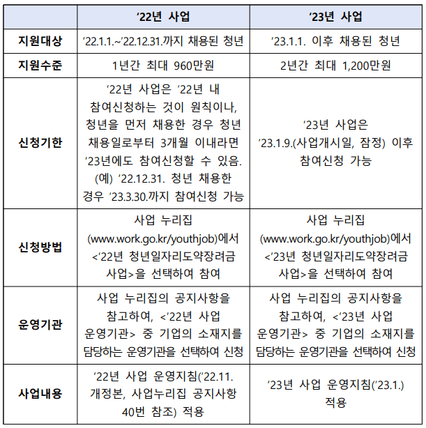 - 22년 채용자의 경우 1년간 960만 원을 지원 → 23년 채용자부터는 2년간 최대 1200만 원을 지원