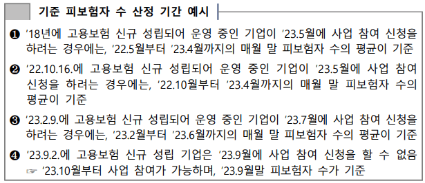 - 지원한도 : 사업참여 신청 직전 월말부터 이전 1년간 평균 고용보험 피보험자 수의 50%(비 수도권 지역은 100%)까지 지원 (단 최대 30명 한도)